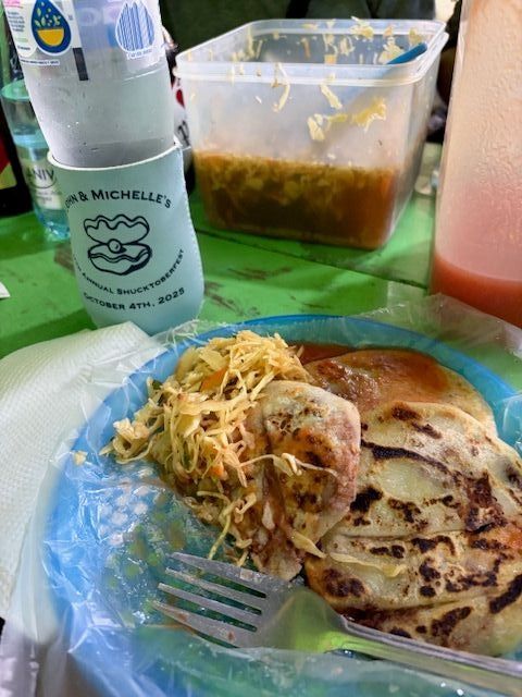 The pupusa is a traditional and popular street food here. It is a stuffed cake made from cornmeal or rice flour, filled with cheese, beans and fried pork. There were also community coleslaw and salsa. Thanks to Traci for the pictures.