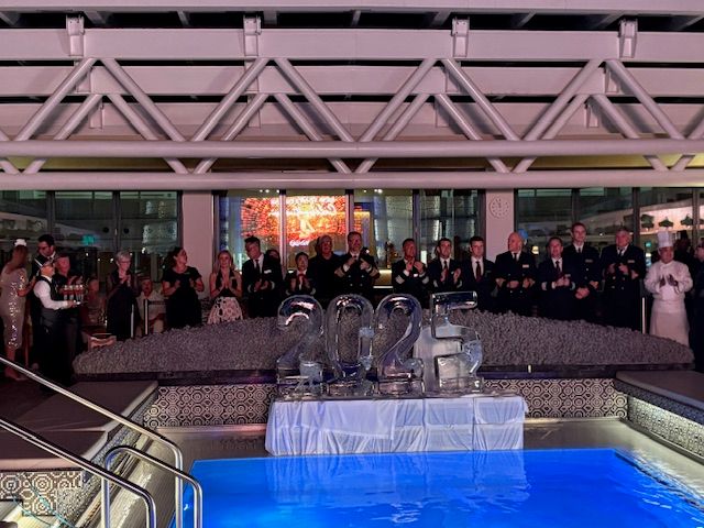 Ice sculpture at midnight they pushed the 5 into the pool and replaced it with a 6. Jim got a video on his recap but for some reason the video cut off as they pushed the 5 into the pool. Goodbye to 2025 and hello 2026!