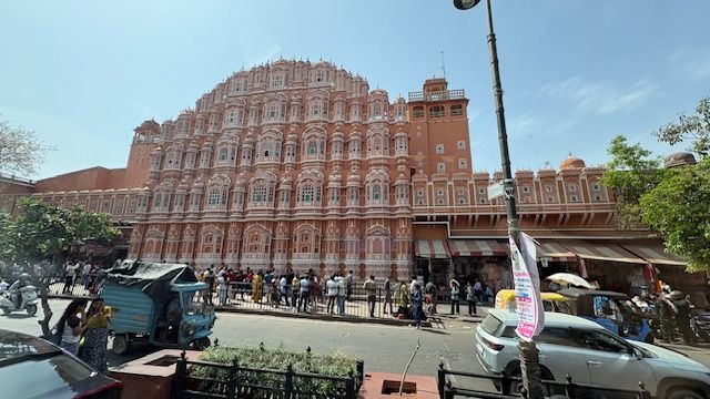 Jaipur is known as the pink city. We drove by Hawa Mahal (Palace of Winds) is an elaborate building encrusted with delicate honeycomb screens and carved balconies from which the royal ladies, confined to their quarters, could view the world outside.