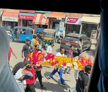 We came upon a funeral procession. Hindu custom has 4 men carrying the body to cremation with others walking with them. The women are not allowed to participate. The flowers on the body indicate that the person was 80+ years old.