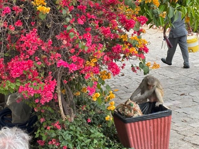 We had an opportunity to shop at the museum co-op. Artists were drawing and painting as we watched. We bought an elephant painting for $80 from a family who is famous for their work. I bought 2 large quartz stone pendants (green and blue) for $30. We were outside waiting for everyone to finish their purchases when a monkey stole one of our groups shopping bag. She had bought some shoes, and he dropped it when he saw it did not contain food. That is him going through the garbage now.
