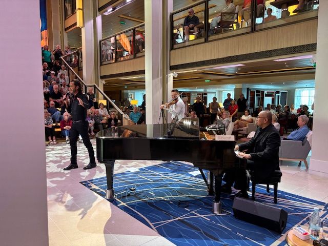 Impromptu concert with 3 very talented musicians who just met a few days ago. Perry on Piano, Douglas Ladnier vocalist and Jakub Trasak violinist.