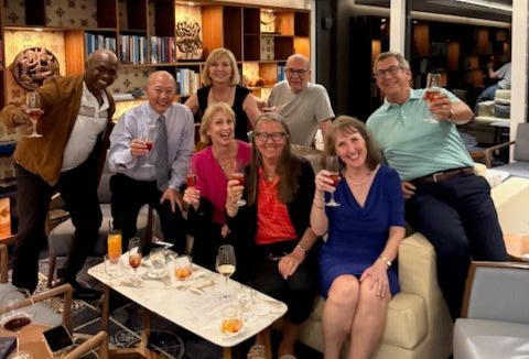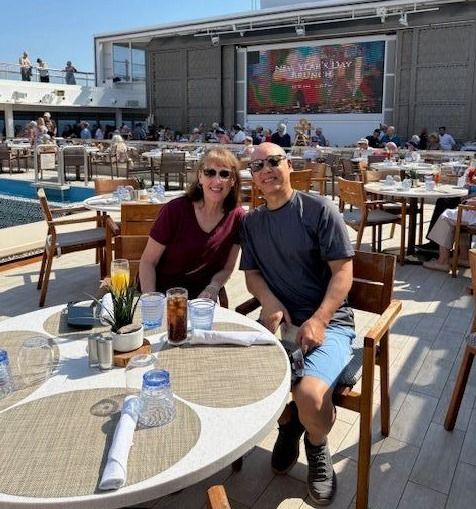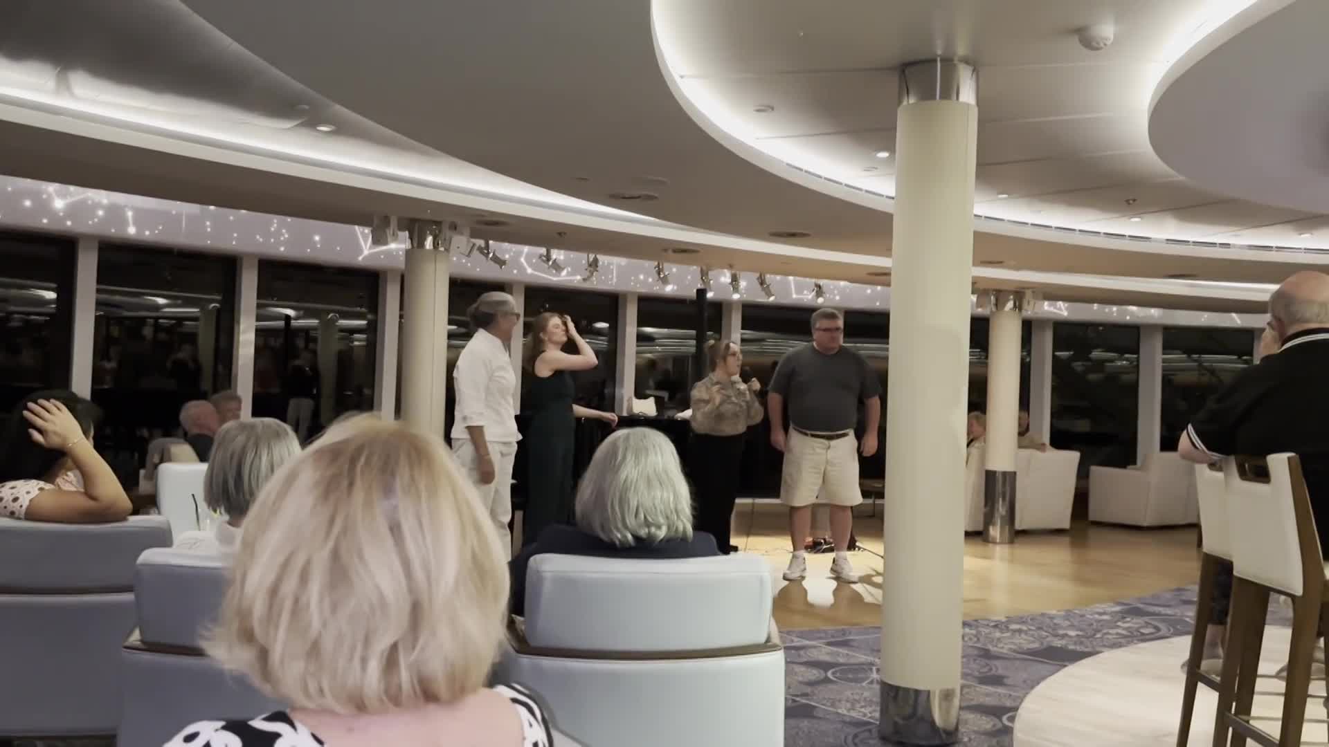 Jim's vlog: Dinner at the Chef's Table w/ entertainers Helene Angley and Terrell Edwards. Then played name that tune with them. Show was Tara Lucas, Assist. Cruise Director.