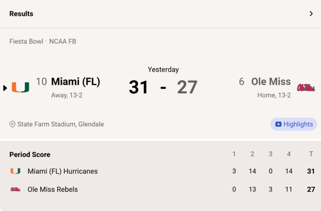 We were able to listen to the Hurricanes Fiesta Bowl game against Ole Miss. Proud of our Canes!