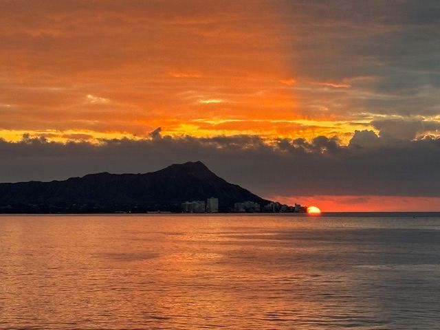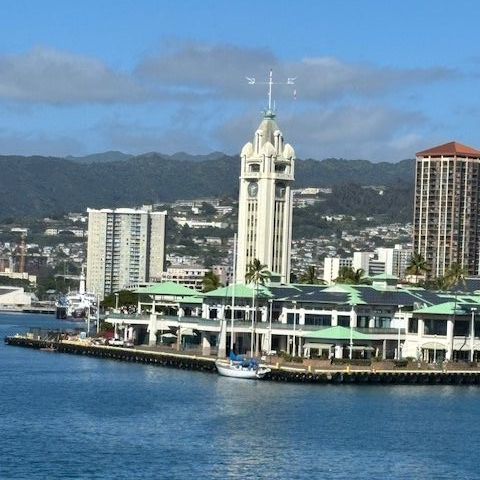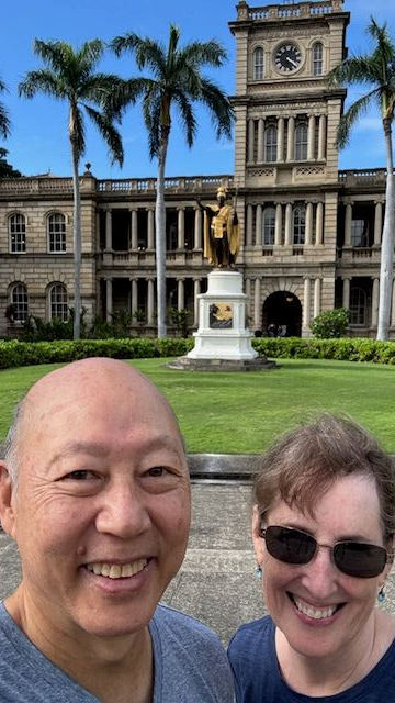 We walked to the US Post Office to mail postcards to Mom/Dad, JJ and a valentine card to Claire's class. We walked to Iolani Place, the coral church and King Kamehameha's palace. The statue is supposed to be life size as he was a very tall man. We had lunch at the Highway Inn, serving traditional Hawaiian food since 1947. Jim had the loco moco and Ina had Kalua pig sliders.